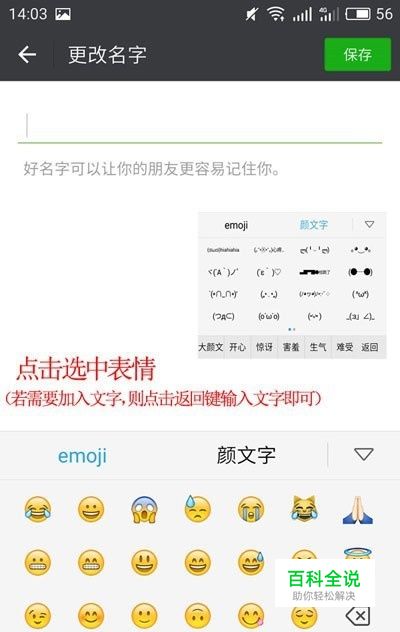点击一下输入框输入法就会显示出来,里边的表情和文字可以自己选择,输入自己的微信名加表情(表情加微信名),点击保存就可以了