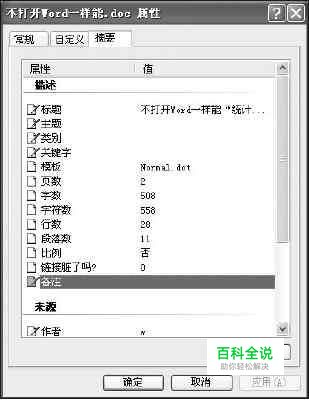 2. 在Windows 2000/XP中。在资源管理器中选中要统计字数的文档,右键单击鼠标,在快捷菜单中选“属性”,在弹出的属性对话框中点“摘要→高级”按钮,即可查看文档的“页数、段落、字数”等内容(如图2所示)。