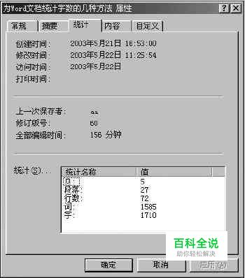 1. 在Windows 98中。在资源管理器中选中要统计字数的文档,右键单击鼠标,在快捷菜单中选“属性”,在弹出的对话框中选“统计”选项卡(如图1所示),即可查看该文档的页、段落、行数、字数等信息。 图1 “统计”选项卡