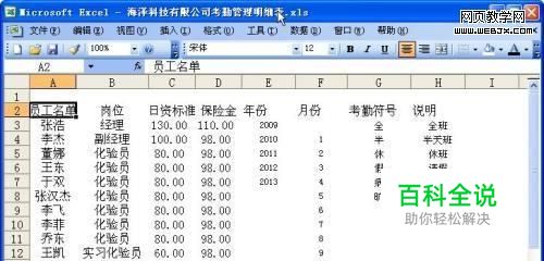 做好考勤数据整理 繁杂无章变条理有序 考勤管理工作必然涉及到公司考勤日期、人员名单、考勤登记符号等资料,而且为了便于每月月末制作工资表,还需要整理每个员工与工资表相关资料,如岗位、日资标准、保险金等等。日常工作中将这些资料及时输入Excel是非常必要的。 启动Excel2003,新建一个工作簿,将其命名,如“海泽科技有限公司考勤管理明细表”,在其中新建一个工作表,命名为“基础资料”,在此表中输入公司员工名单、员工名单、岗位、日资标准、保险金、考勤年份、考勤月份、考勤符号以及考勤符号说明等内容。所谓考勤符号,就是在每日登记考勤时我们所使用的记号,如“全”代表全班、“半”代表半天班、“休”代表休班等,考勤符号可以根据自己公司的使用习惯而定,既可以使用文字,也可以使用图形符号,而考勤符号说明则是为了方便考勤人识别,防止出错(图1)。 为了便于以后考勤工作引用这些基础数据,应该将一些基础数据区域予以定义名称,执行“插入→名称→定义”菜单命令,在弹出的“定义名称”对话框中,添加4个新名称,其分别为:员工名单,其引用位置为“=基本资料!$A$3:$A$22”;年份,其引用位置为“=基本资料!$E$3:$E$7”;月份,其引用位置为“=基本资料!$F$4:$F$15”;出勤,其引用位置为“=基本资料!$G$3:$G$8”。