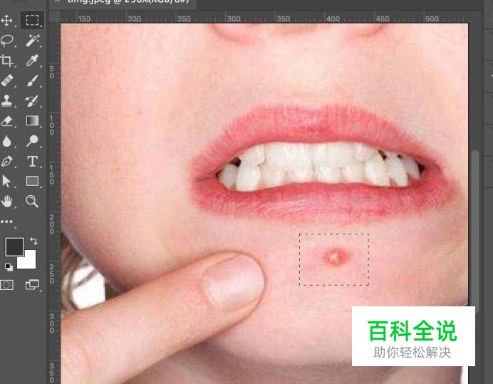 打开图片之后,在工具栏中选择“矩形选框工具”,然后框选需要进行处理的部位。