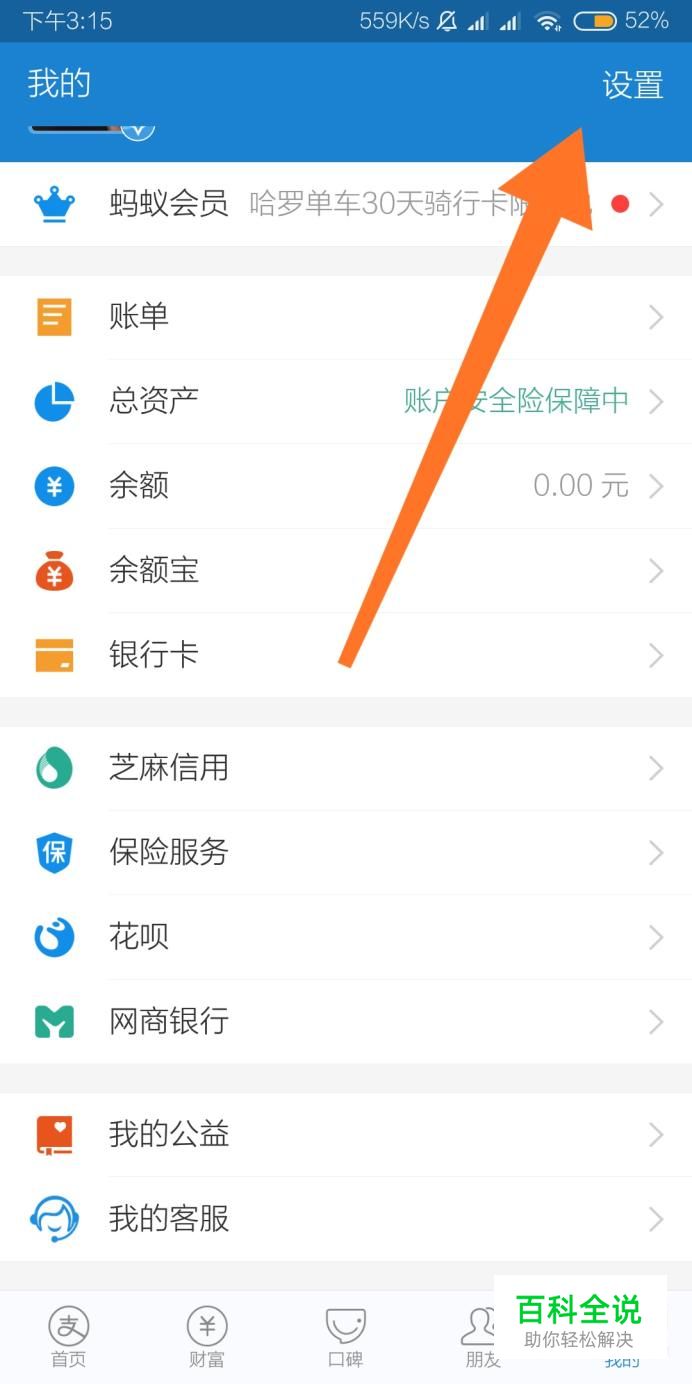 首先点击进入支付宝“我的”页面右上角的“设置”选项。