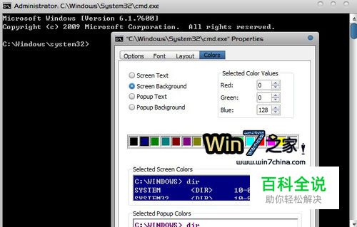自定义命令提示符的颜色 默认状况下,命令提示符是黑底白字显示的,要更改这两者的颜色其实非常简单,点击左上角的黑色小图标 - 属性。然后在颜色选项卡中选择自己合适的颜色即可。同时可以自定义的还有字体、窗口布局等等。
