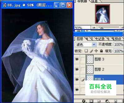 拖入风景(图层四),复制人(背景图层)至于最上,设置模式为滤色。再次复制人(背景图层),至于最上,并增加蒙版,在蒙板上用画笔抹出新背景和透明婚纱,完成。