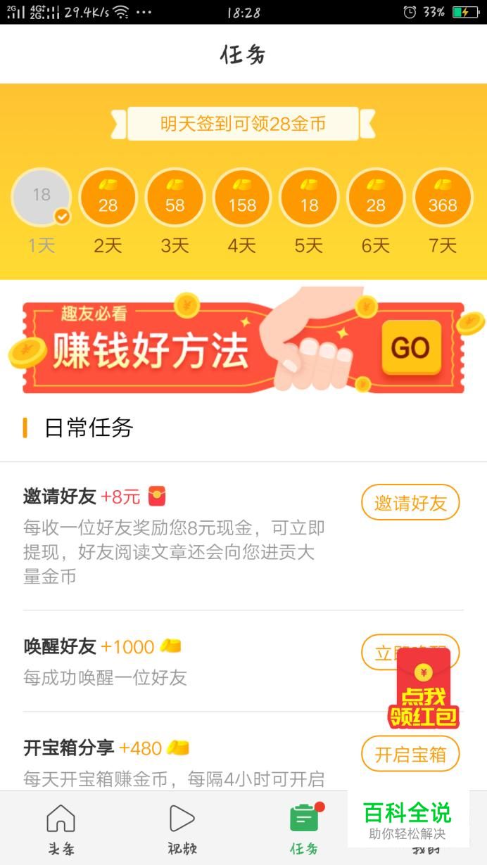 首先打开趣头条登陆,点击任务,就可以做每天的任务赚取金币,首先可以签到领金币。