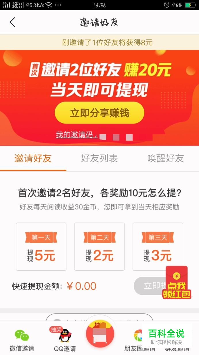 然后还可以邀请好友,邀请一位新用户有8元的奖金,点击邀请好友,再点击“立即分享赚钱”。