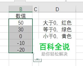 假设现在有5组数字,分别有两组大于0,一组等于0,两组小于0,大于0用红色字体,等于0用绿色字体,小于0用黄色字体。 先将数字输入单元格。并选中单元格。