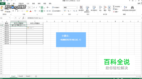 在“B2”单元格输入公式“=NUMBERSTRING(A2,1)”,下拉填充B列。在“C2”单元格输入公式“=NUMBERSTRING(A2,2)”,下拉填充C列。