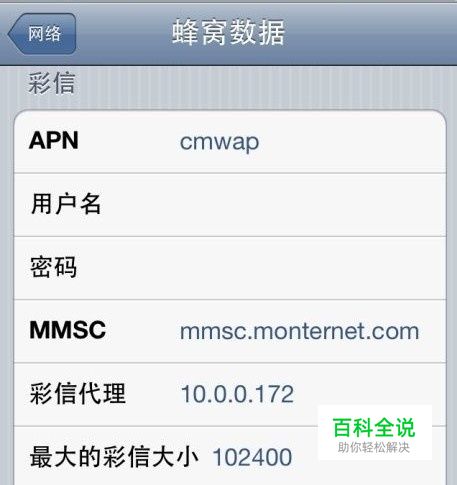 移动卡 依次进入:设置-通用-网络-蜂窝数据网,然后填写表格: 蜂窝数据: APN: cmnet 用户名: 密码: 彩信 APN:cmwap 用户名: 密码: MMSC:http://mmsc.monternet.com 彩信Da1L1:10.0.0.172 最大的彩信大小:102400