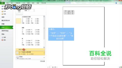 打开Excel,依次点击“文件”——“打印”——“上一个自定义边距设置”——“自定义边距”。