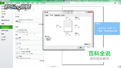 点击“页边距”,设置上下左右边距都为“0”,同时勾选下方“水平”和“居中”选项,点击“确定”。
