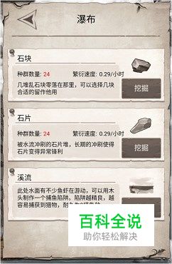 瀑布【威胁等级~0】 通关资源:石块×(7-9)、藤条×(14-15)、石片(6-8); 隐藏关卡:无 循环资源:石块、石片、【陷阱:各种鱼类】; 循环资源生长上限:石块×24、石片×24、陷阱:各种鱼类;