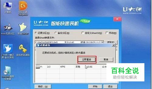我们进入到了WINPE界面后,用手点击运行“U大师一键备份还原系统”工具,然后通过“”按钮找到WIN7系统文件,选择系统安装分区
