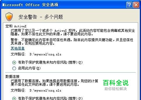 如何启用宏和ActiveX 数据连接(1): 在左上角菜单栏下面可以看到一个安全警告的提示栏目,如下图点击选项会出来一个如下图的对话框。