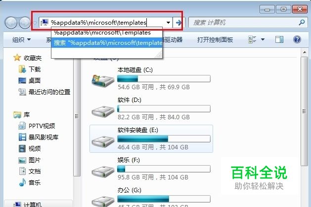 2.打开后将"%appdata%microsoft emplates"这段文字(不加引号)复制在地址栏中(如图红色区域),点击键盘中的“Enter 回车键” 如图