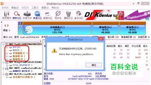 开机启动进入 WinPE,打开 diskgenius 软件,查看分区状况,对于超过 4 个 GPT 分区的情况是无法进行转换的,转换时会有报错提示,如下图: