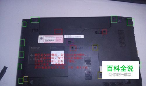 先拆下中间紫色的光驱螺丝,拔出来光驱,然后拆下红色的键盘螺丝,然后是黄色的DIY面板螺丝,最后是绿色的螺丝,需要注意电池下面有一个,光驱下面有三个,大致位置我都标注出来了