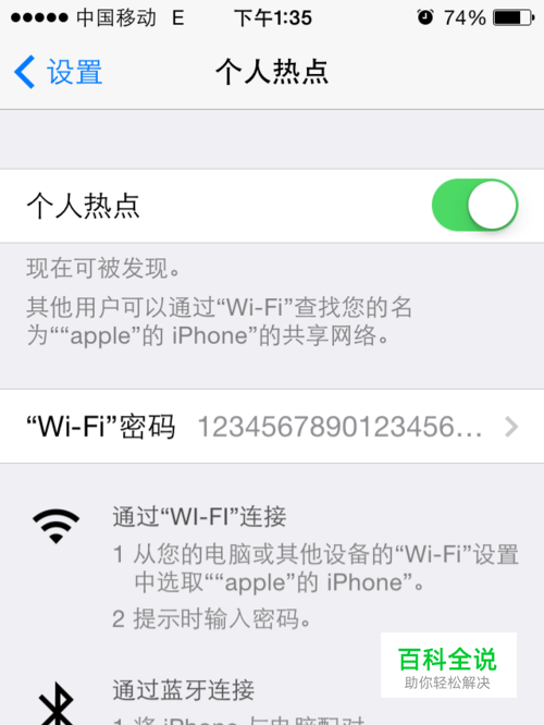 滑开“个人热点”开关,就可以通过“Wi-Fi”查找为“ “apple”的iphone”的共享网络。