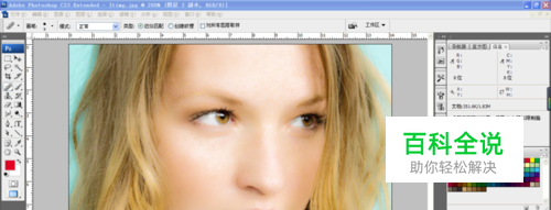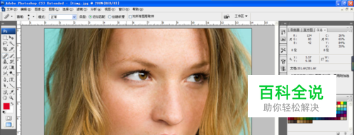 选择用污点修复工具修复皮肤的斑点,用鼠标点击去除皮肤斑点,或者选择用修补工具修补有斑点的皮肤。如图,在红色通道中,脸部的皮肤斑点比较少。