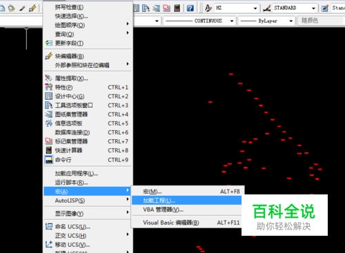 首先,在cad中加载已下载好的宏文件。 操作:从菜单“工具”下拉选择“宏”,在下级菜单中点击“加载工程”或者使用快捷键“ALT+F8”打开宏管理器。