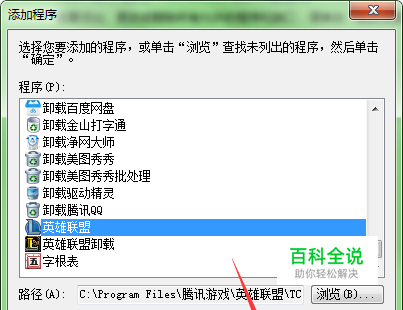 找到英雄联盟的客户端程序,点击”添加“。回到上一步的界面后,点击确定!