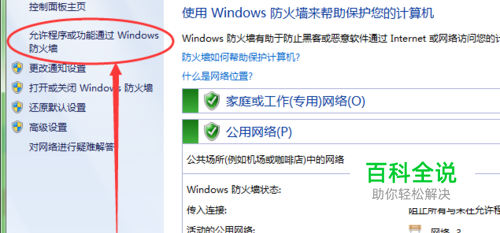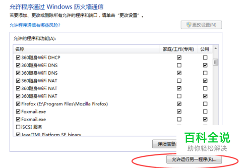 然后如下图所示:选择” 允许程序或功能通过防火墙“