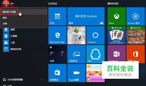 点击开始菜单选择顶部的头像,在出现的菜单中选择“更改账户设置”。