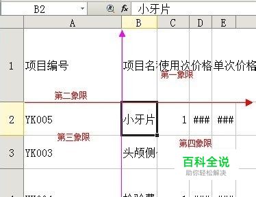 鼠标选择B2单元,选中后有个黑色线条的框。笔者在用了一条红色剪头和紫红色剪头做一个特别说明,红色剪头代表X轴,紫红色剪头代表Y轴,这样就构成了一个象限。分别为第一、二、三、四象限。(见图中红色字体标注的说明) 选择B2单元格就表示我们需要第一行和第一列固定显示,不随屏滚动。
