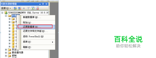 先打开SqlServer2008,然后鼠标选中数据库点击右键,选择列表中的‘还原数据库’,最后弹出还原数据库界面