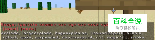 粒子效果我们要用到的命令是“/particle <名称> <x> <y> <z> <xd> <yd> <zd> <速度> <数量> [玩家;实体]”,首先名称是指你输入的粒子效果,总共的效果有30多种