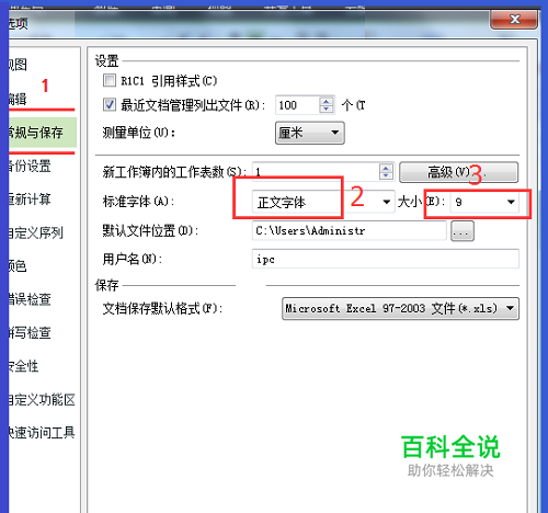选项中, 常用(或者WPS中 常规与保存),再找“ 新建工作簿时”(或者WPS中“ 设置”里面“ 新建工作簿内……);然后对“ 标准字体”选择“ 正文字体”,大小修改: 9或者10.5(注意,WPS中修改为9,微软EXCEL中修改为10.5)