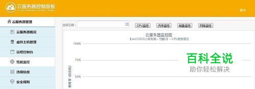 性能监控。点击左侧菜单“性能监控”,进入性能监控页面,你可以看到这是以一个图表形式来显示云服务器的性能监控信息,性能监控包括了CPU、内存、磁盘和网络的使用情况,精确到逐分钟的监控。另外,还可以在时间控件框里选择要查询的具体日期。