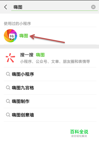 首先,打开微信,在微信右上方主菜单点击“搜索”工具,在搜索栏中搜索 [嗨图]