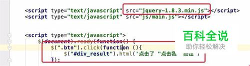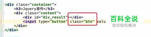 然后添加一些JS代码,(需要先引入Jquery库文件), JS代码就是为样式名为btn的按钮,添加click事件, 点击后在id为div_result的div上写入一些提示信息