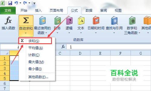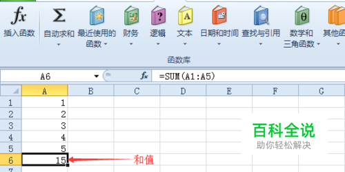 确定后在鼠标点中的单元格就可以看到最终累计求和的值了,再次点中此单元格就可以在“f(x)”后面看到函数“=SUM(A1:A5)”。 函数表示的意思:对A1到A5单元格内的所有数据进行累计求和,可以根据需要求和的数据改变范围。