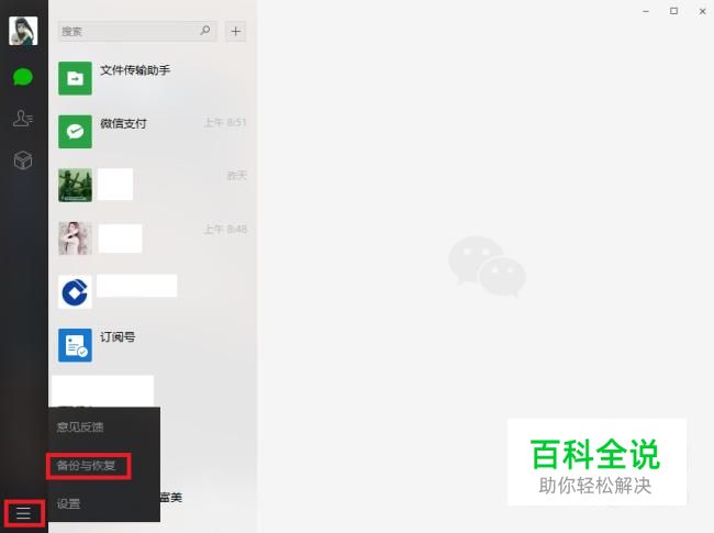 首先在电脑上登录微信,然后点击左下角的三根横线,选择"备份与恢复"。
