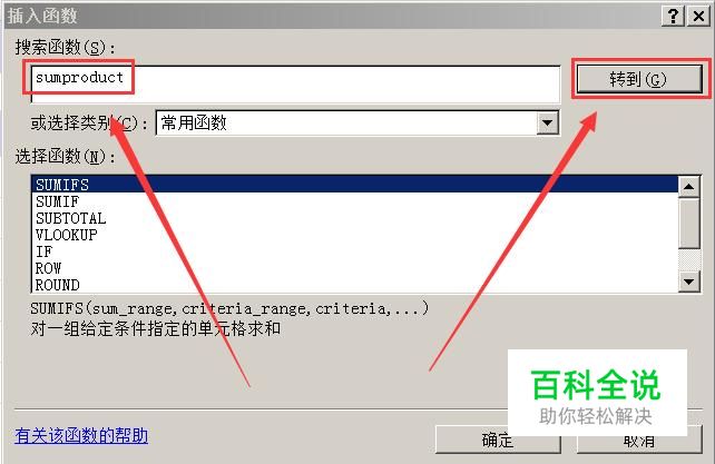 再点击“转到”后,选择函数下会弹出“sumproduct”函数,选中“sumproduct”函数,点击“确定”;