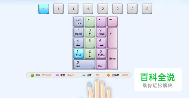 指法:食指负责“7, 4, 1”;中指负责“8, 5, 2”;无名指负责“9,6,3”和“.”;小指负责右侧的“一、十、Enter”;大拇指负责“O”。