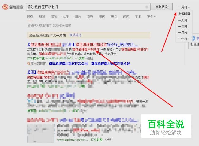 打开搜狗搜索,输入关键字,清除微信僵尸粉软件,为了保证搜索结果的准确性可以将搜索时间设置在一周以内。我们这里以第一个结果为例。