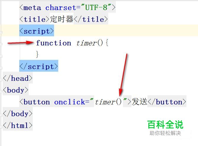 新建一个html页面,然后设置一个按钮,并且给这个按钮绑定一个函数。比如咪咪我就设置了一个函数timer,待会我们就用这个函数。