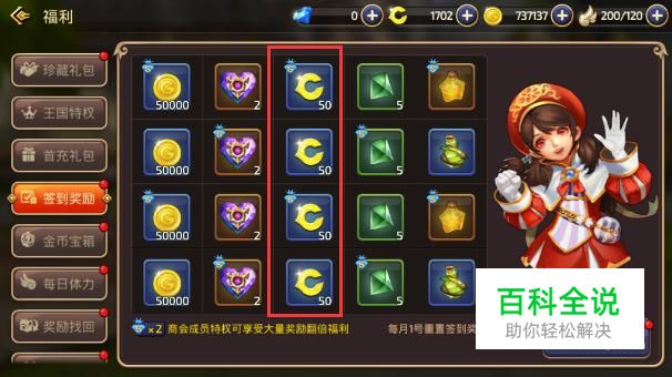 签到奖励: 在游戏中玩家每天登录帐号后可以签到一次,通过签到可以获得金币、绿玛瑙(装备强化材料)、精灵升星药水等奖励。当玩家当月的签到次数到达一定的次数还能获得50枚龙币奖励。