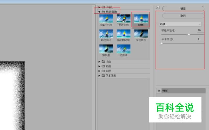 从滤镜库里面找到“画笔描边”里面的“喷溅”,选择并设置如图所示参数