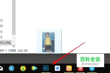 将需要去除红眼的图片,鼠标左键推拽到任务栏ps图标里,如图,这样就会在ps中打开该图片。