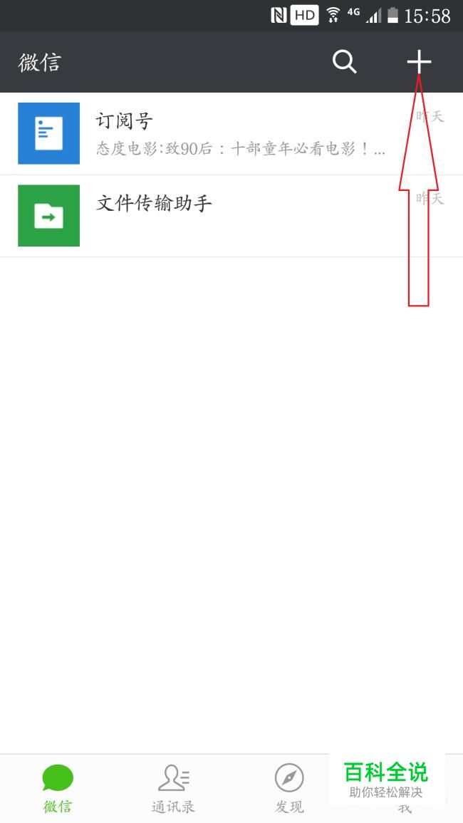 介绍一下如何添加使用微信小程序。进入微信,点击右上角的“+”图标。