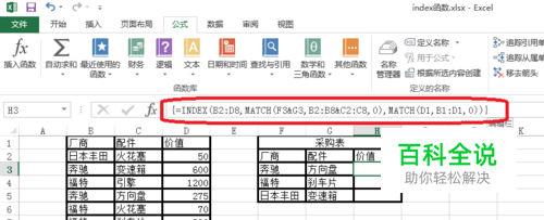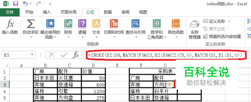 4.如图所示,index函数通过在区域B2:D8中查找奔驰方向盘的行号和列号,行号和列号交叉返回的就是要查找的值。 match函数返回行号和列号。 MATCH(F3&G3,B2:B8&C2:C8,0) 公式解释通过连接符&把奔驰方向盘连接起来,然后返回位置为4。