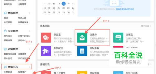 首先进入到优惠券工具页面,进入方法【卖家中心】-【营销中心模块下】找到【店铺营销工具】-【优惠券】如果没有购买该工具的,页面会提示订购