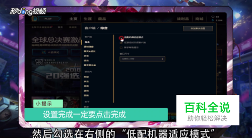 点击游戏客户端首页右上角的“设置”,选择左侧的“综合”,勾选在右侧的“低配机器适应模式”,点击下方的“已完成”即可。