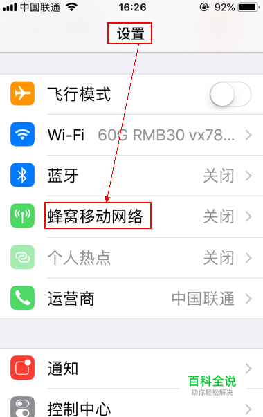 打开手机“设置”,并接着打开“蜂窝移动网络”