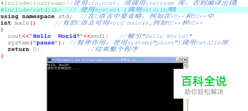 C++程序结构 : 在介绍C++语言程序的结构之前,我们先来看一个简单的例子: 例1.1 在屏幕上输出“Hello World!”。 #include<iostream> //使用cin,cout,须调用iostream 库,否则编译出错 #include<cstdlib> // 使用system( )调用cstdlib库 using namespace std; //在C语言中要省略,例如在VC++和TC++中 int main() //有的C语言可用void main(),例如TC++和VC++ { cout<<"Hello World!"<<endl; //输出"Hello World!" system("pause"); //暂停作用,使用system("pause")调用cstdlib库 return 0; //结束整个程序 } 运行结果: Hello World!