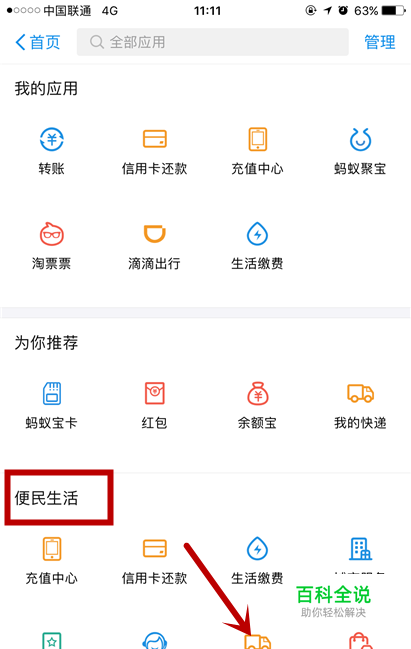 在下面,我们会看到一个大的选项内容叫做便民生活,而其中有一个小的选项叫做我的快递,点击一下进入。